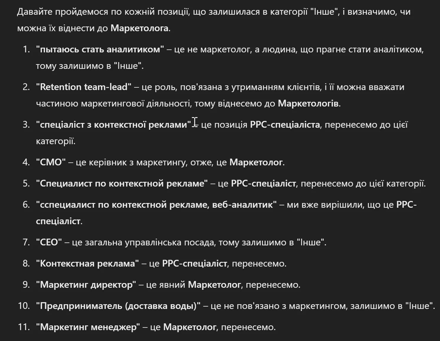 Як ви бачите, цей підхід наче добре працює, але насправді є й багато ситуацій, де чат повиставляв Інше там, де при логічному аналізі ми б без проблем віднесли відповідь студента до потрібної мені категорії. Один з таких прикладів “CMO” - мені, наприклад, зрозуміло, що це Маркетолог, але оскільки студенти пишуть таку відповідь не часто, чат просто проігнорував цей ключ при аналізі. Щоб правильно співвіднести такі відповіді ми використаємо ще один спосіб.